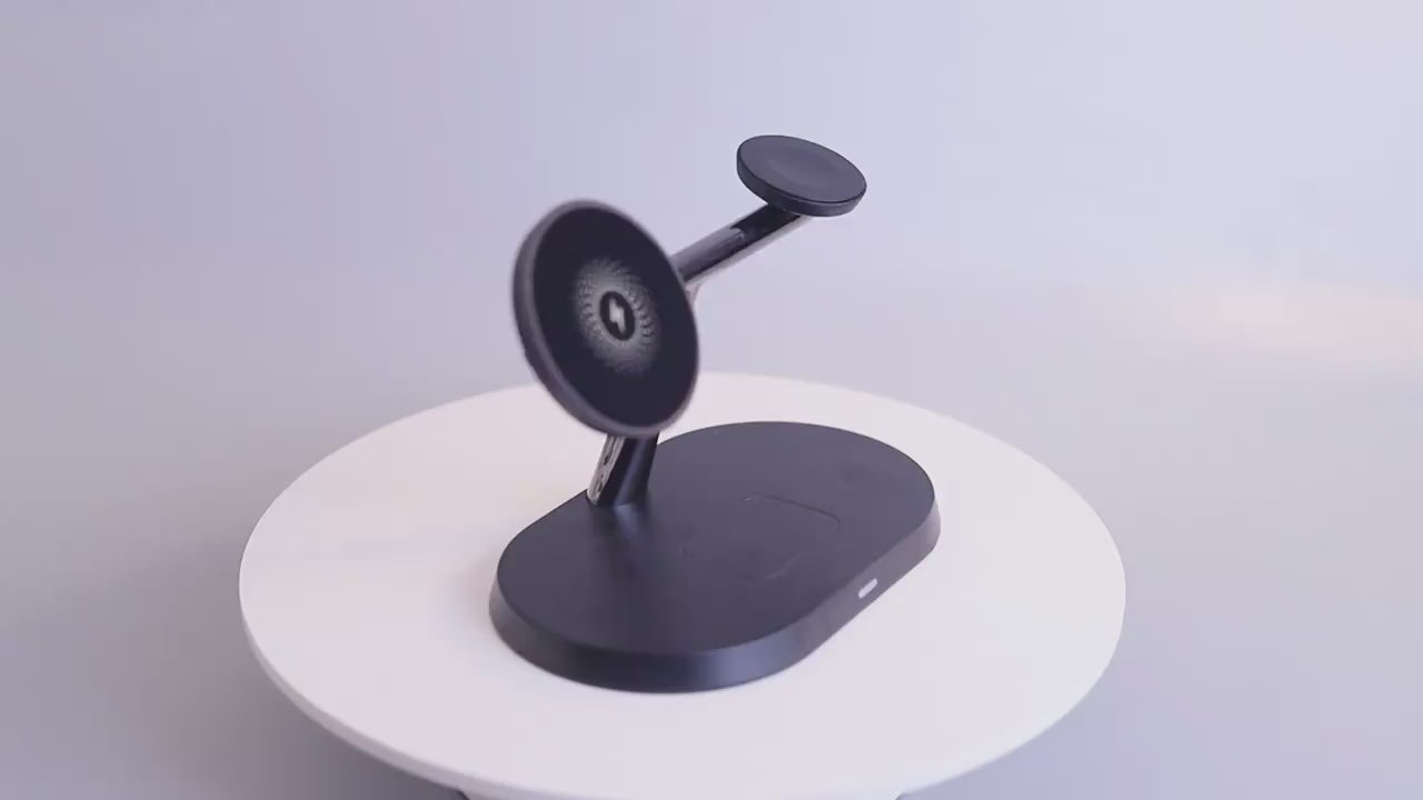 Un support de charge sans fil 3-en-1, élégant et fonctionnel, conçu pour accueillir plusieurs appareils en même temps.